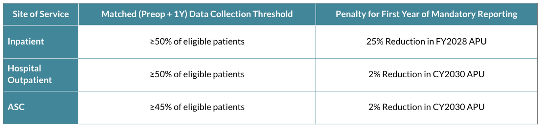 CMS applies pay-for-reporting penalties, not pay-for-performance penalties. The focus is on data submission compliance rather than outcomes. Facilities that fail to report the required percentage of matched pre- and post-op PROMs and other data elements will see reductions in their annual payment update from CMS, as shown below. Notably, this reduction will apply to the entirety of a hospital’s Medicare APU, not just the portion emanating from hip and knee replacements.