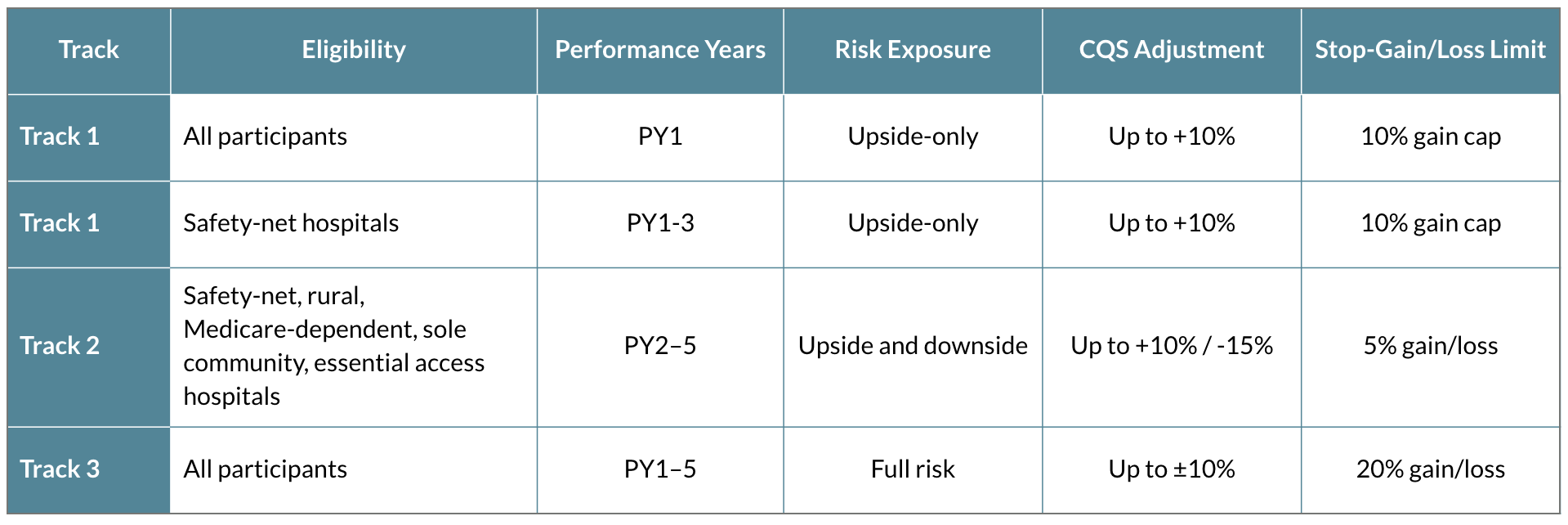CMS has established three distinct participation tracks within the Transforming Episode Accountability Model (TEAM), each defining a hospital’s level of financial risk and reward. All hospitals begin in Track 1 unless they opt to begin in Track 3; after PY1, Tracks 1 and 2 are reserved for specific hospital types: